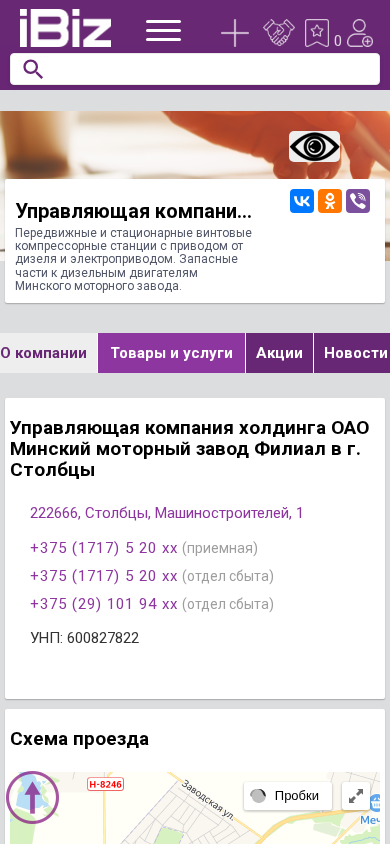 | Название / Заголовок | Управляющая компания холдинга ОАО Минский моторный завод Филиал в г. Столбцы - Передвижные и стационарные винтовые компрессорные станции с приводом от дизеля и электроприводом. Запасные части к дизельным двигателям Минского моторного завода. . 222666, Столбцы, , Машиностроителей, 1 |