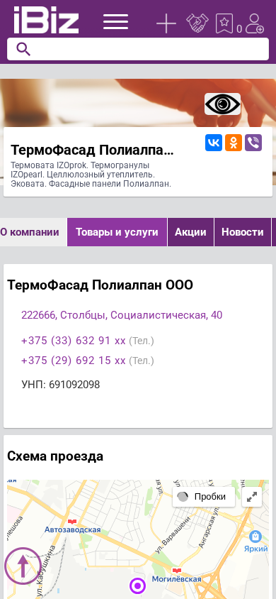 | Название / Заголовок | ТермоФасад Полиалпан ООО - Термовата IZOprok. Термогранулы IZOpeаrl. Целлюлозный утеплитель. Эковата. Фасадные панели Полиалпан.. 222666, Столбцы, , Социалистическая, 40 |