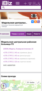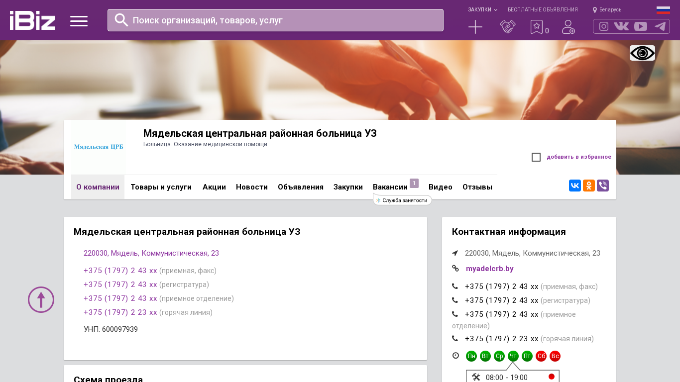 | AI-анализ | language: ru This website is for Мядельская центральная районная больница УЗ (Myadel Central District Hospital) in Belarus, offering medical services. The address is given as Коммунистическая, 23, 220030, Мядель. The contact numbers listed are +375 (1797) 2 43 xx (reception, fax), +375 (1797) 2 43 xx (registration), +375 (1797) 2 43 xx (admission), and +375 (1797) 2 23 xx (hotline). The business registration number is 600097939. The website provides information on the hospital's location, opening hours (Mond |