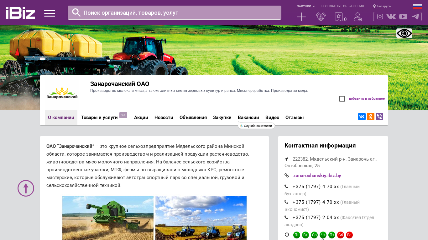 | Название / Заголовок | Занарочанский ОАО - Производство молока и мяса, а также элитных семян зерновых культур и рапса. Мясопереработка. Производство меда.. 222382, , Занарочь аг., Октябрьская, 25 |