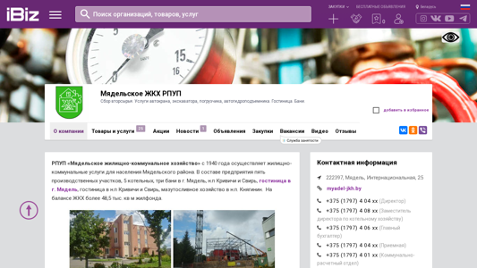 | AI-анализ | The website is for Мядельское ЖКХ РПУП (Miadelskoe JKH RPUP), a communal services company based in Мядель, Belarus, providing various services including waste collection, crane, excavator, loader, and hydraulic lifting services, as well as lodging and bathing facilities. The company was established in 1940 and operates five production sites, five boiler houses, three bathhouses in Мядель, Кривичи, and Свирь, and two guest houses in Мядель and Кривичи. The company offers both free and paid services in areas such as water supply, heating, sanitation, technical maintenance, and the rental of bans and guest houses. It also provides ritual services, installation of water meter devices, repair and construction works, production of building materials, and transportation services. |
