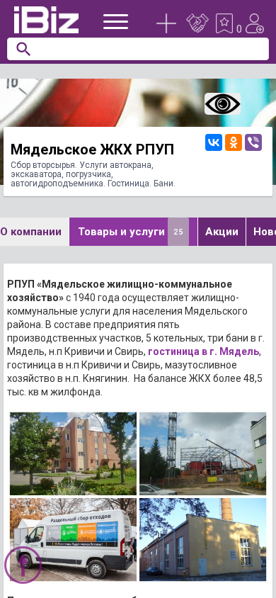 | Название / Заголовок | Мядельское ЖКХ РПУП - Сбор вторсырья. Услуги автокрана, экскаватора, погрузчика, автогидроподъемника. Гостиница. Бани.. 222397, Мядель, , Интернациональная, 25 |