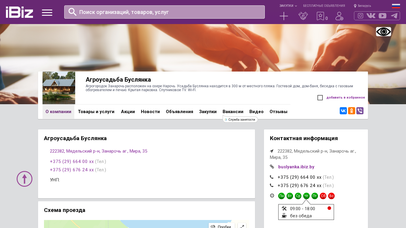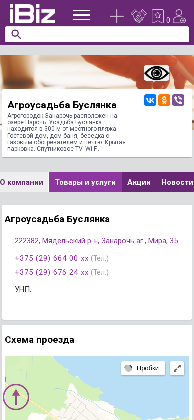 | AI-анализ | This online resource is a website for Agro-Farmstead Buslyanka, located at Lake Naroch in Belarus. The farmstead is 300 meters away from the local beach. It offers a guest house, a sauna house, a gazebo with a gas heater and a fireplace, a covered parking lot, satellite TV, and Wi-Fi. The contact information and a map scheme for reaching the farmstead are provided. The company offers services and products related to green tourism, agro-tourism, and ecotourism. The website includes sections for news, announcements, vacancies, videos, and testimonials. The company's contact information, opening hours, and location are also provided. |