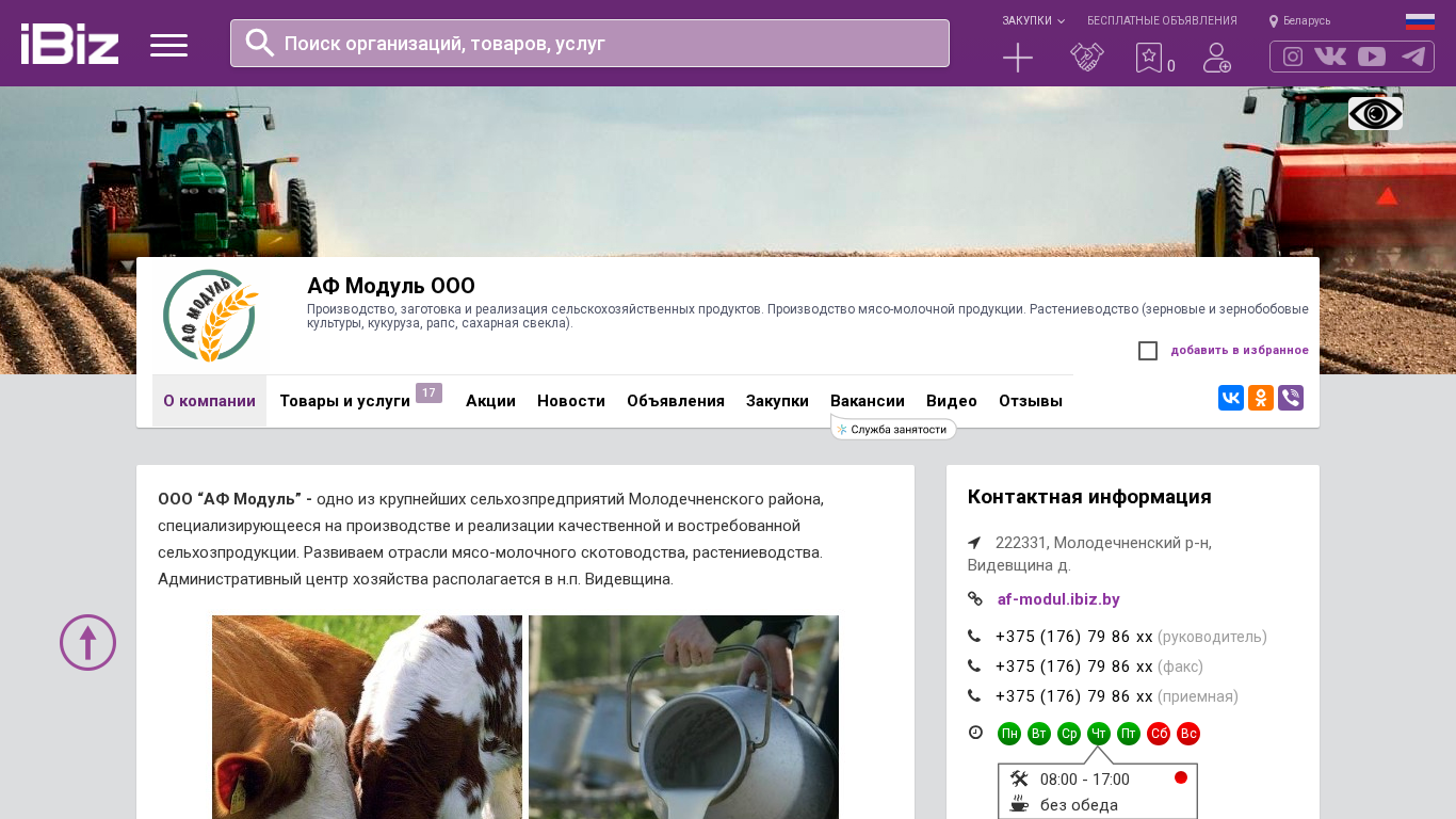 | Название / Заголовок | АФ Модуль ООО - Производство, заготовка и реализация сельскохозяйственных продуктов. Производство мясо-молочной продукции. Растениеводство (зерновые и зернобобовые культуры, кукуруза, рапс, сахарная свекла).. 222331, , Видевщина д. |