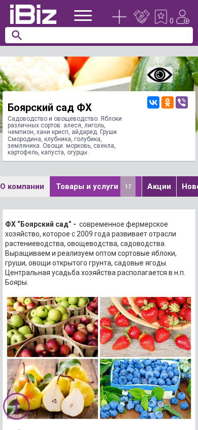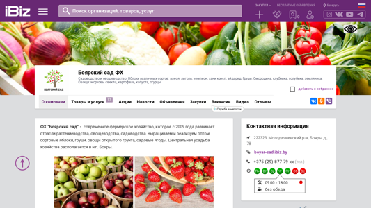 | Название / Заголовок | Боярский сад ФХ - Садоводство и овощеводство. Яблоки различных сортов: алеся, лиголь, чемпион, хани крисп, айдаред. Груши. Смородина, клубника, голубика, земляника. Овощи: морковь, свекла, картофель, капуста, огурцы.. 222323, , Бояры д., 78 |