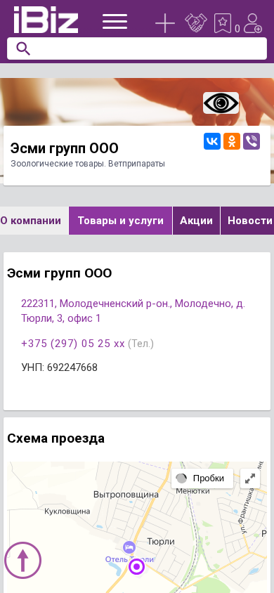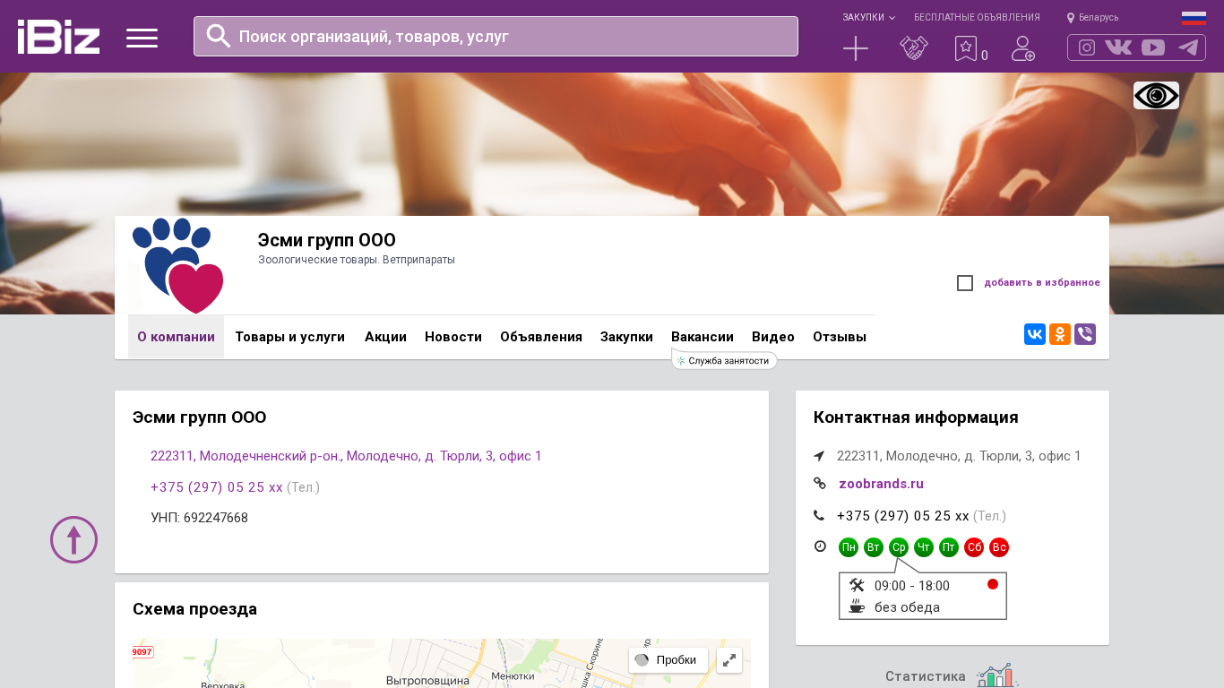 | AI-анализ | This website is for Esmi Grup OOO, a company based in Moloдечно, Belarus, specializing in zoological products and veterinary supplies. The website provides a scheme for reaching the office located at д. Тюрли, 3, and contact information including phone number +375 (297) 05 25 xx. The company's UNP number is 692247668. The website offers a range of zoo products such as animal food, preparations for animals, toys, animal cages, grooming, shampoos, vitamins, veterinary services, and animal clothing. The office hours are Monday to Friday from 9:00 to 18:00, excluding lunch hours. The website also includes a section for news, announcements, vacancies, videos, and customer |