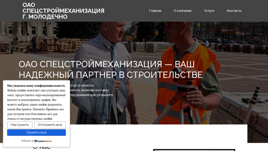 | AI-анализ | The website <oaossm.by> is the homepage of OAO Specstroymehanizatsia of Minsk region, Molodecnogo city. The title is "Главная - ОАО Спецстроймеханизация г. Молодечно" which translates to "Main page - OAO Specstroymehanizatsia of Molodecnogo city". The description tag contains information about the company's services, including construction, capital repair, equipment supply, and consulting. The website offers high-quality services in the field of construction, capital repair, and landscaping. The company aims to satisfy customer needs by providing reliable and professional solutions. The website also features a section for completed projects, showcasing their achievements in the industry. The keywords tag is empty, and there is no visible mention of contacts or cookies on the page. The |
