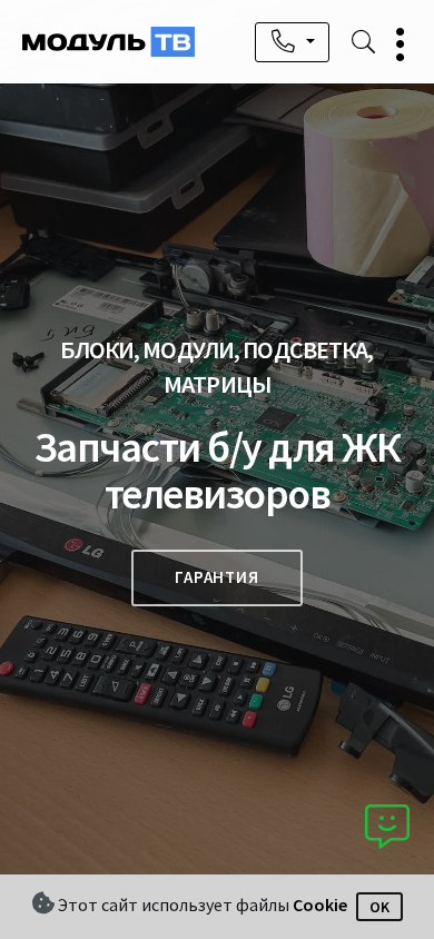 | SEO-описание | Телемастерская «Модуль ТВ» производит разборку ЖК телевизоров на запчасти, с любыми конструктивными особенностями. У нас широкий ассортимент запчастей для телевизоров: блоки питания, MAIN платы, T-CON, LED-драйверы, Inverter, Wi-Fi, Bluetooth, кнопки, фотоприёмники, LED-подсветка, тюнеры, матрицы, шлейфы, пульты, динамики. |