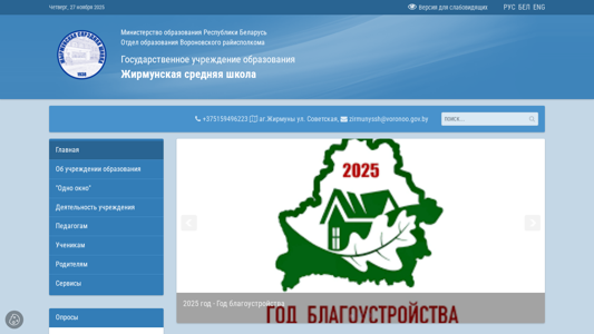 | AI-анализ | The website is for Жирмунская средняя школа (Jirmana Secondary School) located in the town of Жирмуны, Belarus. The school year is 2025-2026, and the website includes information on the school's schedule, news, documents, and contacts. The school is part of the Voronovsky district educational system, and is governed by the Ministry of Education in the Republic of Belarus. The website features a trust box, a hotline for food organization, and sections for family and crisis prevention. There are also announcements for school events, such as excursions and educational opportunities, as well as an archive of past news. The website also promotes various initiatives, including a program for agriculture professionals and a patriotic project. The school's contact information is provided, including a phone number and email address. |