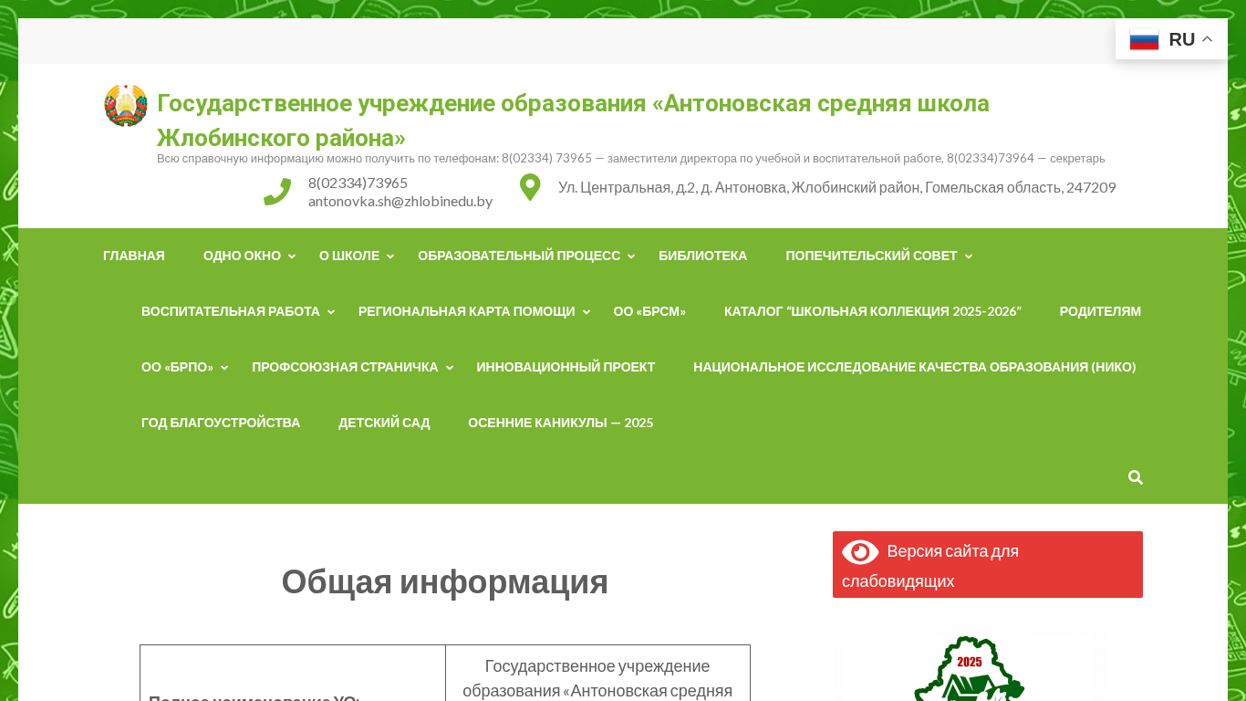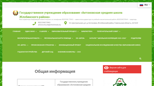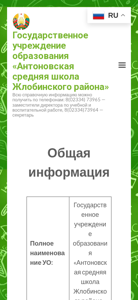| Название / Заголовок | Государственное учреждение образования «Антоновская средняя школа Жлобинского района» — Всю справочную информацию можно получить по телефонам: 8(02334) 73965 — заместители директора по учебной и воспитательной работе, 8(02334)73964 — секретарь |