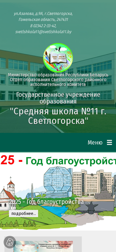 | Адрес | ВЫКЛ, Показать, Контакты - Средняя школа №11 г. Светлогорска, РУС, БЕЛ, ENG, Версия для слабовидящих, ул. Азалова, д.9А |