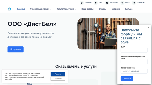 | AI-анализ | This online resource is a Belarusian company website, named "ДистБел" (DistBel), providing sanitary services and equipment for automatic meter reading under key. The main offered services include installation, verification, and additional equipment setup for water meters, as well as their connection to a remote data transmission system for water supply companies. The company also offers services for checking and upgrading thermal meters and repairing water meter units across Belarus. The website contains sections for products and services, company information, and contact details including phone numbers, emails, and social media handles for Instagram, Viber, Telegram, and email. |