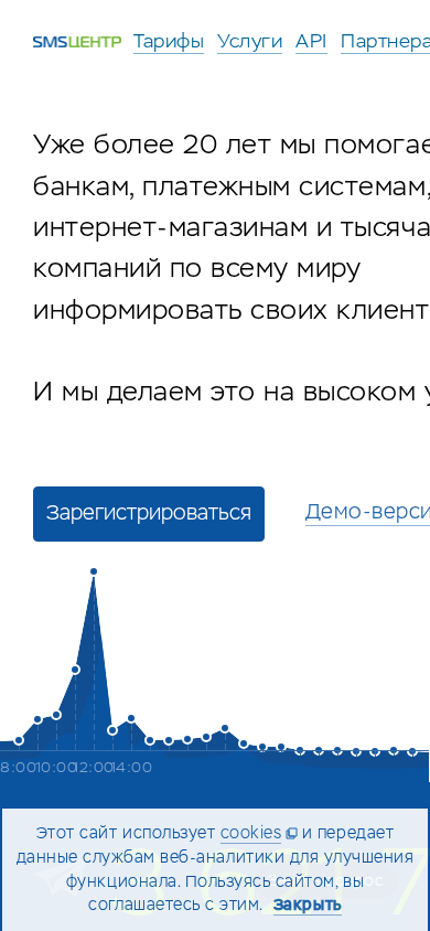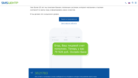 | SEO-описание | SMS Центр – сервис для отправки и приема SMS-сообщений, EMS и бинарные SMS, E-mail2sms, HLR, MMS, Voice, E-mail рассылки и другое. Гарантированная доставка сообщений по всему миру, удобные тарифы и API-интеграция. |