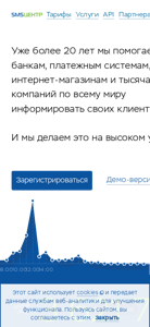 | AI-анализ | The web project SMS Центр is a service for sending and receiving SMS messages, EMS and binary SMS, E-mail2sms, HLR, MMS, Voice, E-mail broadcasts, and other features. It guarantees worldwide message delivery, competitive tariffs, and API integration. The site has been helping banks, payment systems, online stores, and thousands of companies worldwide inform their clients for over 20 years, with 91% of messages being delivered today. The service offers stable operation due to its own development and in-house programming team, automatic contact name insertion, instant message sending, and priority for individual messages over mass broadcasts. It ensures delivery through direct connections to operators and maintains a reliable service. The system also protects against DDoS attacks, provides real-time billing and reporting, and offers improved international coverage through overseas offices and channels. Users can |