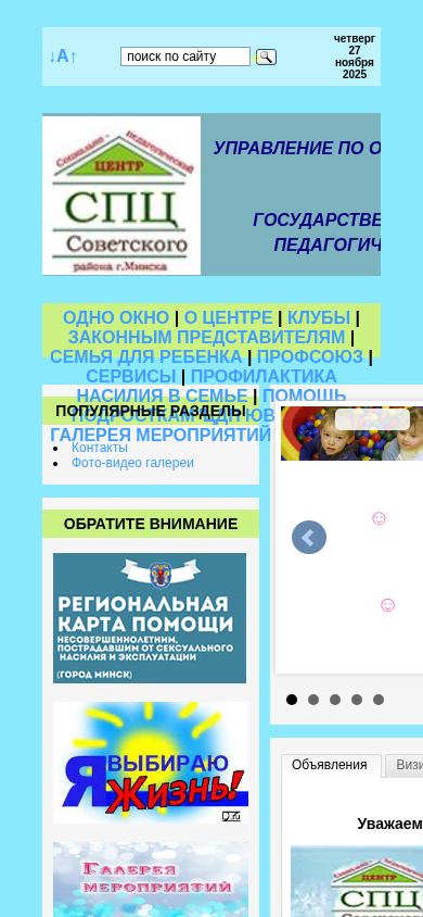 | AI-анализ | The portal 'Soviet Social-Pedagogical Centre of Minsk' is a government educational institution located in the Soviet district of Minsk, Belarus. The website provides information about the center, its services, and various clubs. Visitors can find sections on support for families with children, a pro-union section, and a section on preventing violence in families. The site offers a child-friendly consultation room for children who have been victims or witnesses of violence. Additionally, there are popular news sections, photo-video galleries, and contact information. The site also includes a copyright notice and a map for finding the center's location. The site's visitors can change the font size using the 'Ctrl' keys and the mouse scroll wheel. The site's statistics show that it has a high citation index and that the banner on the site is frequently clicked on. The center's mission is |
