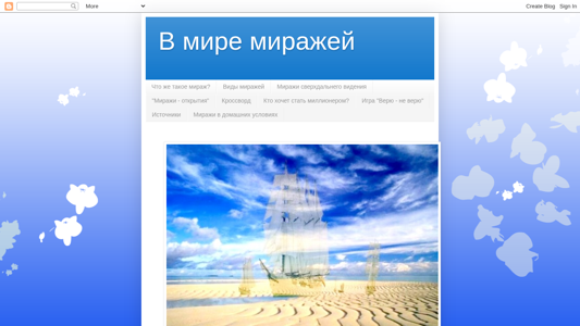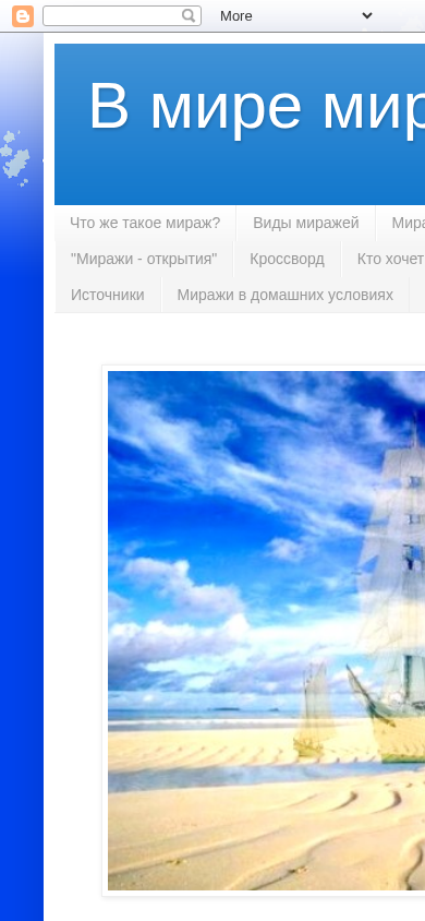 The website "В мире миражей" (In the World of Mirages) is a blog dedicated to the exploration of mirages, including their different types and occurrences. The blog features a crossword puzzle, a game titled "Верю - не верю" (Believe or Not), and a section for sources and references. The author invites readers to share their comments and offers a contact form for inquiries. The website is built on the Blogger platform using the "Proстая" theme, with images credited to Jason Morrow.