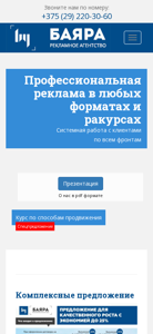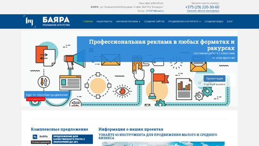 | AI-анализ | This online resource, titled "Professional Advertising in Any Formats and Angles | БАЯРА," offers a comprehensive approach to promoting products or services. From analysis to implementation, the website specializes in various forms of advertising, including outdoor, website production and internet promotion, contextual advertising, content marketing, social media marketing, YouTube channel creation, and video production. The company's office is located in Vitsebsk, Belarus, and their contact information includes a phone number and email address. The website also features a blog and information about their projects, such as the creation of a website for a construction equipment rental business and the promotion of a silver tank project for Wargaming. |