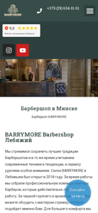 | AI-анализ | This online resource is a men's barber shop and salon named BARRYMORE located in Minsk, Belarus. The website offers services for men's haircuts, shaving, and styling. The shop features professional barbers and a cozy atmosphere, along with pleasant promotions. There are two BARRYMORE locations in Minsk, one in Lebyazhie and the other in Melnikaitse, both offering high-quality men's grooming services. The Lebyazhie location was established in 2018, and the Melnikaitse location, known as BARRYMORE GOLF, began operations in 2021. Clients leave feeling satisfied and relaxed. Pricing includes a creative director haircut for 80 BYN, a haircut for children aged 5 to 1 |