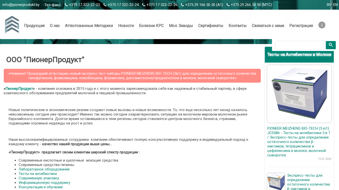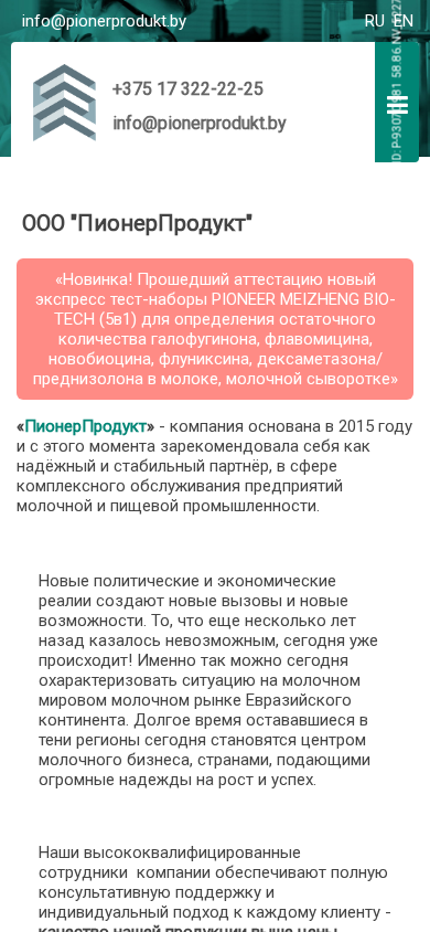 | AI-анализ | The portal PionerProdukt.by is an official website for Company PionerProduct, based in Belarus. The site focuses on providing information and products related to the dairy industry, specifically testing for antibiotics in milk. Keywords associated with the site include 'antibiotics', 'milk', 'tests', and 'dairy industry'. The site offers a range of laboratory equipment such as centrifuges, indicative strips, autoclaves, scales, thermometers, and packaging materials. Additionally, it provides services for ATP monitoring and offers various consumables for cleaning and disinfection, as well as filters for milk. The company was founded in 2015 and has since established itself as a reliable and stable partner in the complex servicing of businesses in the dairy and food industries. New political and economic realities have brought new challenges and opportunities to the European d |