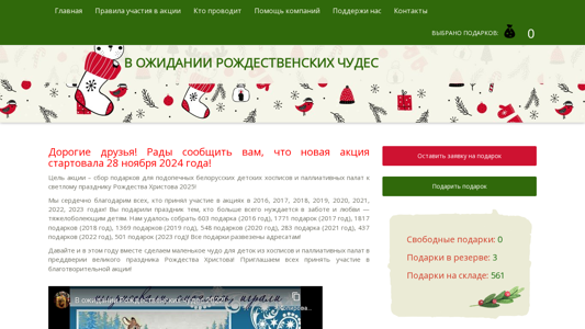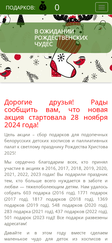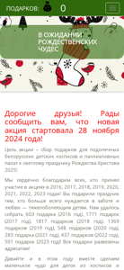 | AI-анализ | --- The web project "DaridoBurovets.by" is an initiative aimed at collecting gifts for children in Belarusian children's hospices and palliative care units in anticipation of Christmas 2025. The website provides rules for participation, contact information, and a selection of available gifts. The project has been annually organized since 2016, with a total of 5013 gifts collected in previous years. Currently, there are 561 gifts in stock, and users can choose and donate a gift online. Participants have five days to arrange pick-up of the gift from the designated point before it is returned to the website. The project accepts donations of hygiene items and soft clothing in natural materials. |