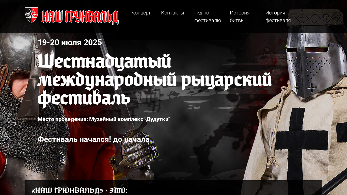 | SEO-описание | XVI Международный рыцарский фестиваль средневековой культуры и музыки Наш Грюнвальд пройдёт в Дудутках 20-21 июля 2025 года. Реконструкция грюнвальдской битвы, зрелищные рыцарские турниры и грандиозный концерт. |