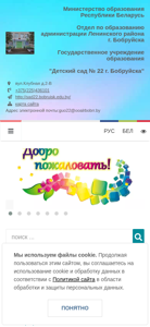 | AI-анализ | This online resource is the official website for the "Детский сад № 22 г.Бобруйска" (Childcare Center No. 22 in Bobruisk), a state educational institution under the Ministry of Education of the Republic of Belarus. The website provides information about the center's location, contact details, administrative procedures, services, and various educational programs. It also includes sections for parents, such as counseling services from psychologists and defectoologists, and a parental council. The website is structured with various pages for different groups, a photo-video gallery, and an interactive map. The administration section includes information on the admission process, conditions for enrollment, and a vacancy board. The website is accessible via a single entrance point and includes a telephone directory, contact information for various organizations, and a situation center for assistance to people with disabilities. The website also offers electronic services |