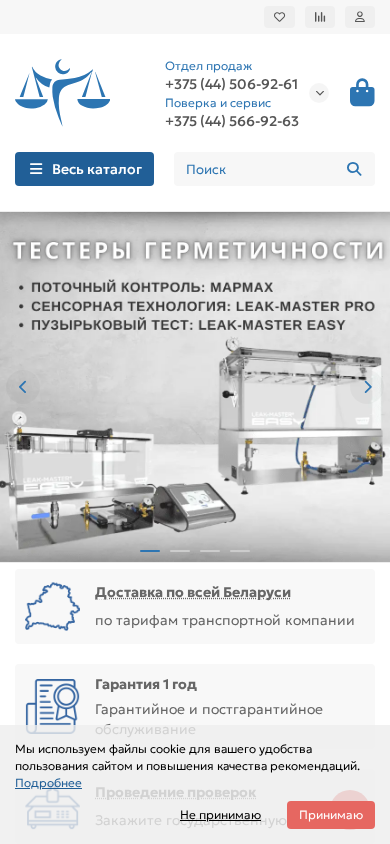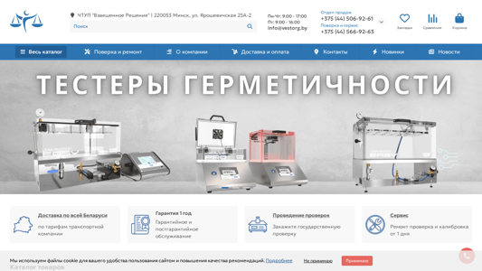 | AI-анализ | The website is for "ЧТУП Взвешенное Решение", an electronics weighing scales and components company located at 220053 Minsk, Yaroshivichskaya 25A-2. The opening hours are Monday to Thursday from 9:00 to 17:00 and Friday from 9:00 to 16:00. Contact information includes an email address (info@vestorg.by), a sales department phone number (+375 (44) 506-92-61), and a service phone number (+375 (44) 566-92-63). There are also options for contact via Telegram, WhatsUp, and Viber. The website offers a catalog of various types of weighing scales including trading, tabletop, counter, laboratory, floor, |