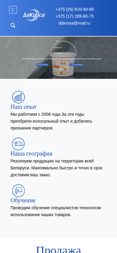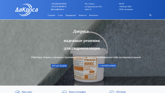 | AI-анализ | --- The website "Dakrosa.by" is a Belarusian e-commerce platform specializing in the sale of hydroisolation materials from leading manufacturers. With a long-standing history and extensive experience, the company offers a wide range of products at competitive prices, ensuring quality control throughout production. Exclusive representatives of various producers such as ZAO "Parad," GK "Techpolimer," and OOO "Aquabarier," customers can contact the company via phone number (29) 610-40-69 or (17) 289-80-75, or email dakrosa@mail.ru. The business hours are Monday to Friday from 9:00 AM to 6:00 PM, with weekend closures. The website also provides information on the company, products, and contacts, as well as categories for |