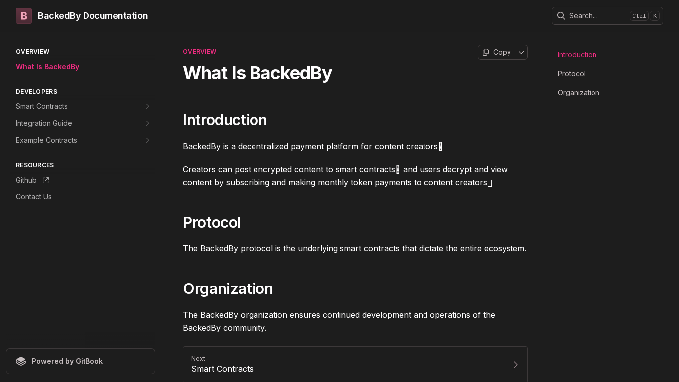 | SEO-лексика | backedby contracts smart the what documentation contact content and overview resources protocol organization creators ctrl developers integration guide example github |