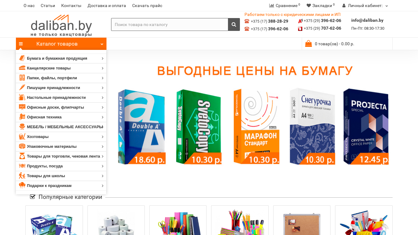 | SEO-описание | ООО Компания Далибан - одна из ведущих оптовых компаний Республики Беларусь, реализующих бумагу а4, канцтовары, этикетку, этикет-пистолеты, кассовую ленту, упаковку. Наша компания имеет интернет-магазин, отдел оптовых продаж, собственный склад с постоянным наличием необходимого запаса товаров, службу доставки. |