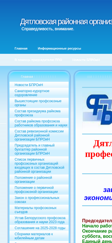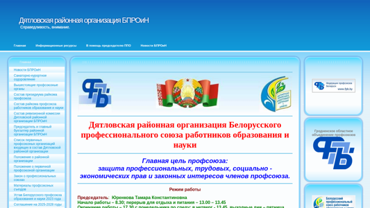 | AI-анализ | --- The web project "Дятловская районная организация БПРОиН" (dyatlovorkprof.lepshy.by) is a regional branch of the Belarusian Professional Union of Education and Science Workers. The site provides various resources and information for the union's activities, including news, position statements, and guidelines. Key topics cover issues like fairness, labor, education, science, and worker representation. The site also includes a calendar of events, a list of primary organizational units, and information about the union's leadership and positions on various labor-related matters. The site's main goal is to protect the professional, labor, and social-economic rights of union members. The site operates from Monday to Wednesday, with the chairman available for appointments on the third Tuesday of each month. Other contacts for the regional council of veterans and deputy chairpersons are also provided |