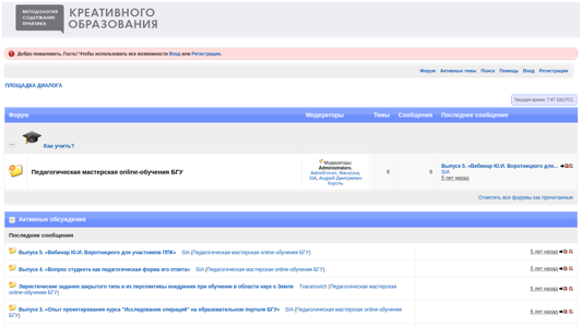 | AI-анализ | This website is titled "Площадка Диалога" (Dialogue Platform) and is described as a bulletin board system written in ASP.NET, using the software "Yet Another Forum.NET". The website contains various topics and active discussions, with moderators including "Administrators", "AdminForum", "Marozova", "SIA", and "Андрей Дмитриевич Король". The forum includes topics such as pedagogical masterclasses, online education, and various educational projects from BGU. The forum was last updated 5 years ago, with the last message being sent by "SIA". There are currently 61 registered users, with 2 active users and 2 guests currently online. The forum contains 6 topics and 6 messages in 1 subforum. The website is powered by YAF.NET and was generated in 0.0 |