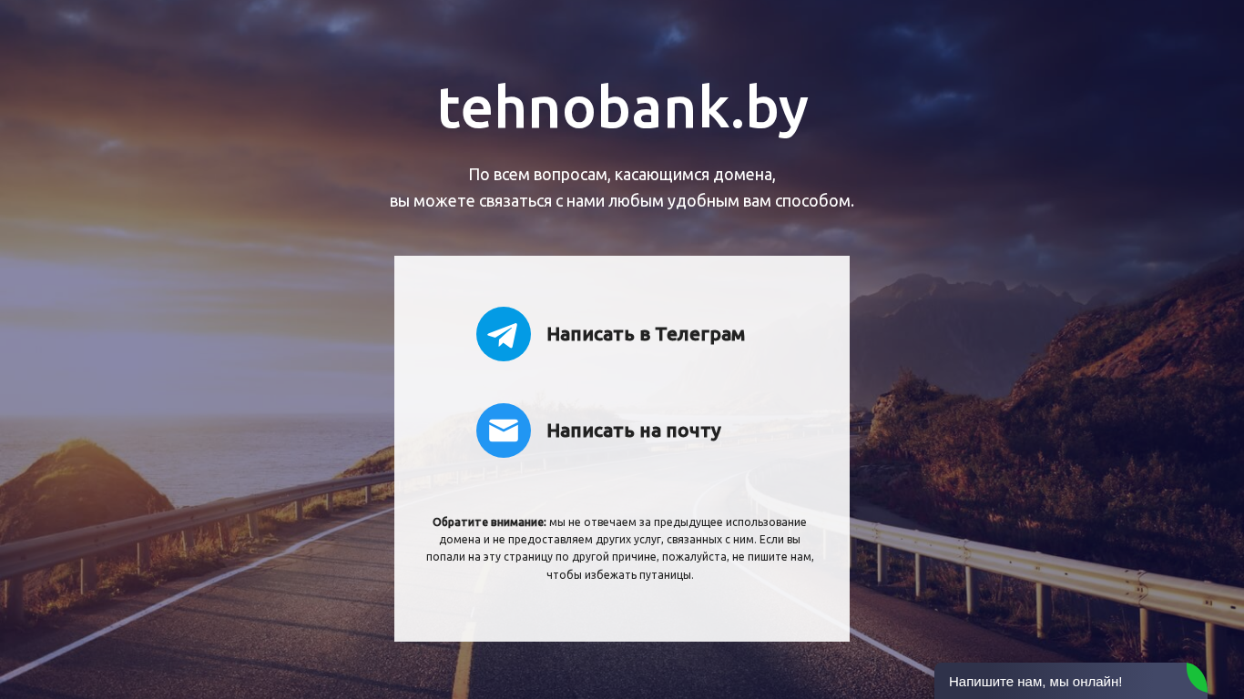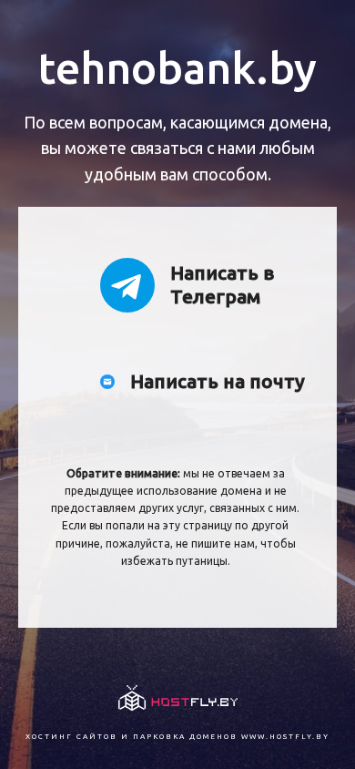 | AI-анализ | --- The website tehnobank.by is currently for sale. For all inquiries related to the domain, please contact us through any convenient method. You can write to us in Telegram, send an email or draw attention to this notice. Please note that we do not respond for the previous use of the domain and do not provide any related services. If you arrived at this page for another reason, please do not contact us to avoid confusion. Hosting of websites and domain parking are offered by www.hostfly.by. Please write to us, we are online! |