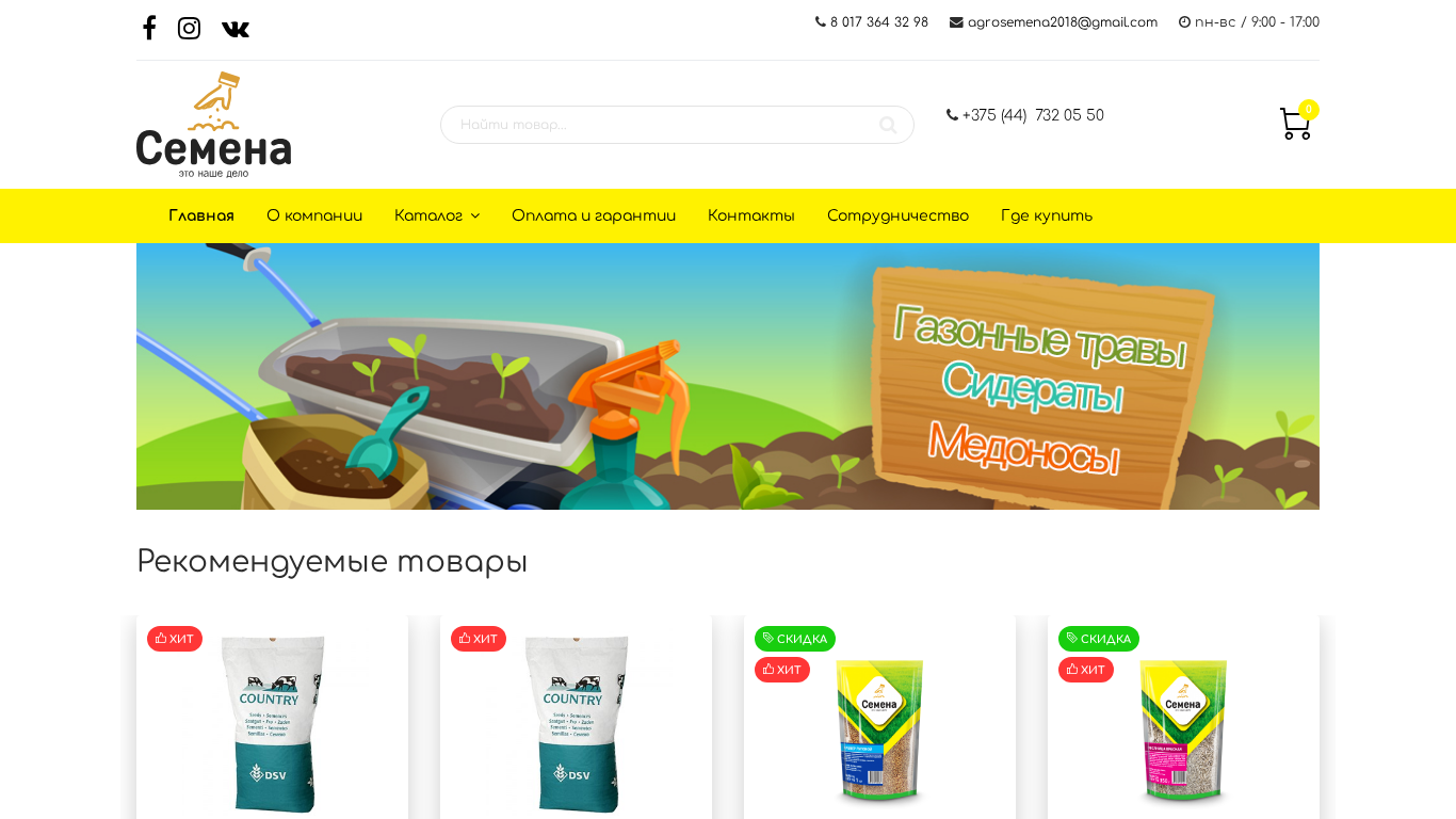 The website is an e-commerce platform selling grass seeds and grass mixtures in Belarus. It offers delivery, as well as both cash and non-cash payment options in multiple cities including Minsk, Brest, Vitsebsk, Gomel, Grodno, and Mogilev. The site provides a catalog of seeds, grasses, and hay for various purposes, including lawns, pastures, and cornfields. The homepage features a section on the company, as well as a shopping cart and links to popular items. Users can purchase recommended products in one click, and there are options for discounts on certain items. The site also offers consultations for customers and information on where to buy the products locally. The site's top words include "grass," "seeds," "tray," and "buy," indicating a focus on sales of grass-related products.