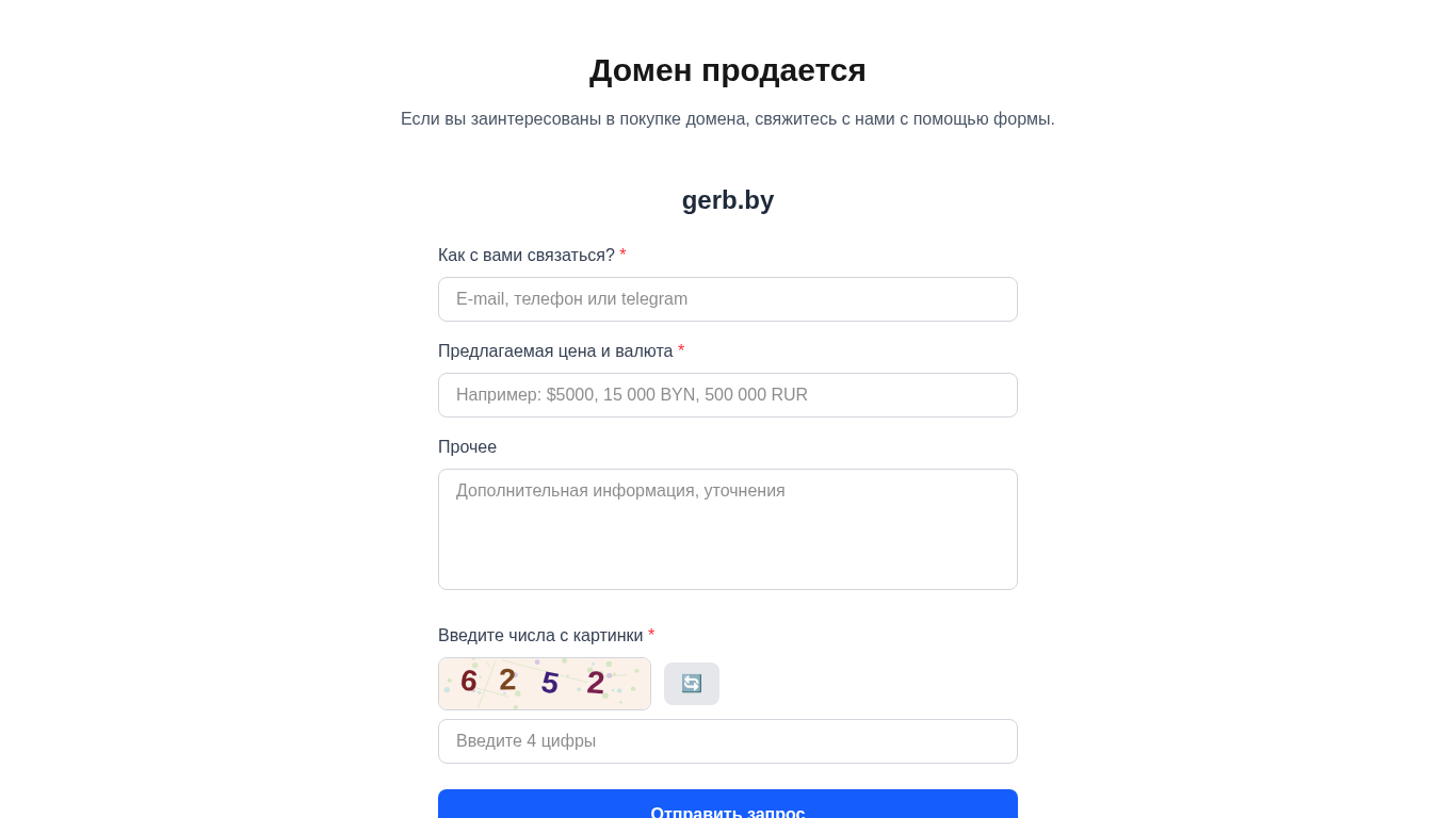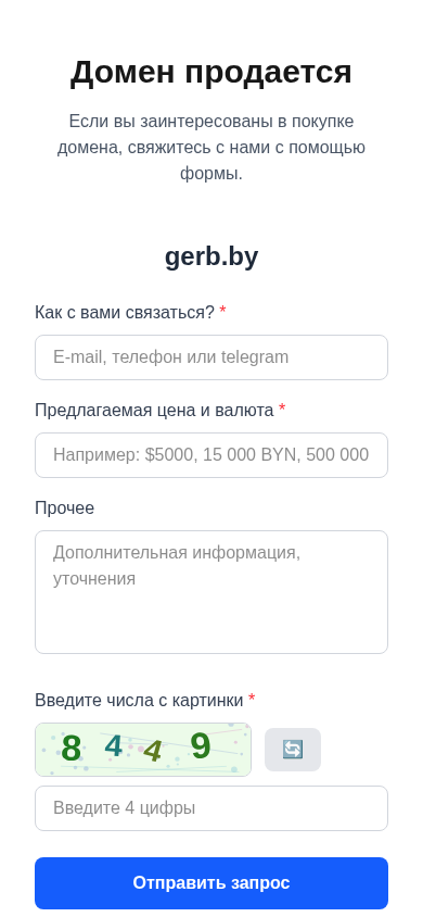 | AI-анализ | --- This online resource, gerb.by, is a domain for sale. Interested buyers should contact the site owners using the provided form. The sale includes details on the proposed price and currency. Additional information may be required, such as entering numbers from an image to verify the request. |