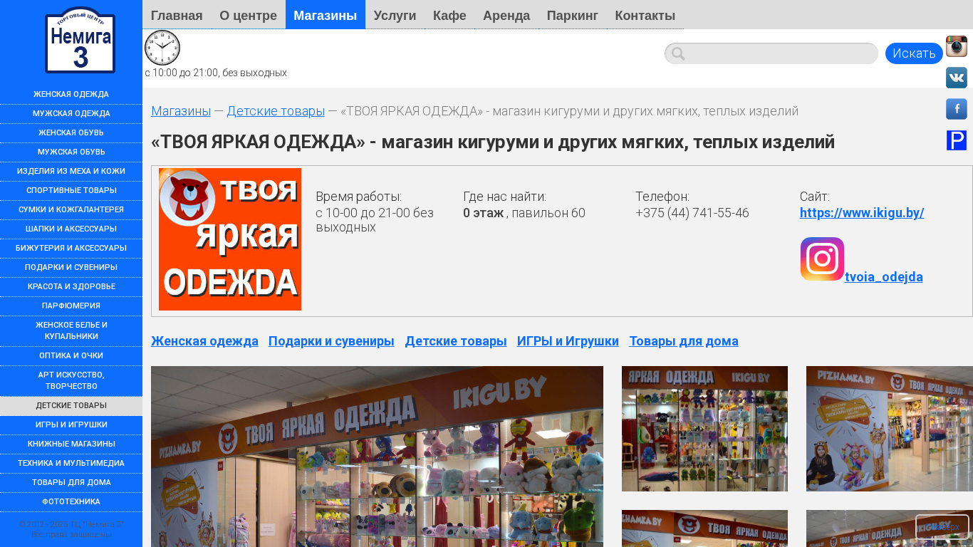 | AI-анализ | The web project "Your Bright Clothing - «ТВОЯ ЯРКАЯ ОДЕЖДА»" is a store located in the Nemiga 3 Shopping Center in Minsk, Belarus. This shopping center offers various shops, offices for rent, services, cafes, and parking facilities. The store specializes in selling bright and colorful kigurumi-pajamas, pledovs, cushions, slippers, toys, and other items. It offers a wide range of clothing for women and men, including footwear, accessories, and items made of leather and meh. Additionally, the store sells sports equipment, bags, hats, jewelry, gifts, beauty products, perfumes, lingerie, swimwear, glasses, art supplies, children's toys, and books. The shopping center, which also includes technology and home goods stores, a photo studio |