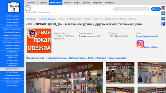| Название / Заголовок | «ТВОЯ ЯРКАЯ ОДЕЖДА» - магазин ярких кигуруми-пижам, пледов, подушек, тапочек, игрушек и др. :: Торговый Центр НЕМИГА 3. г.Минск |