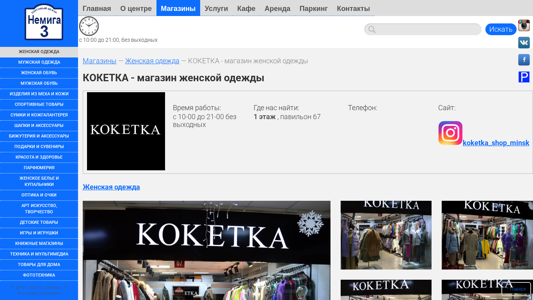 This online resource is a women's clothing store named KOKETKA, located in the Nemiga 3 Shopping Center in Minsk, Belarus. The shopping center offers various shops, offices, services, cafes, a parking lot, and a mall plan. KOKETKA is one of the retailers in the mall selling women's clothing, along with men's clothing, footwear, accessories, and various other items such as cosmetics, perfumes, and gifts. The mall has a floor plan that includes multiple levels with different shops and services, and there are various rules for visiting and operating within the center. The mall also offers rental spaces for shops and offices.