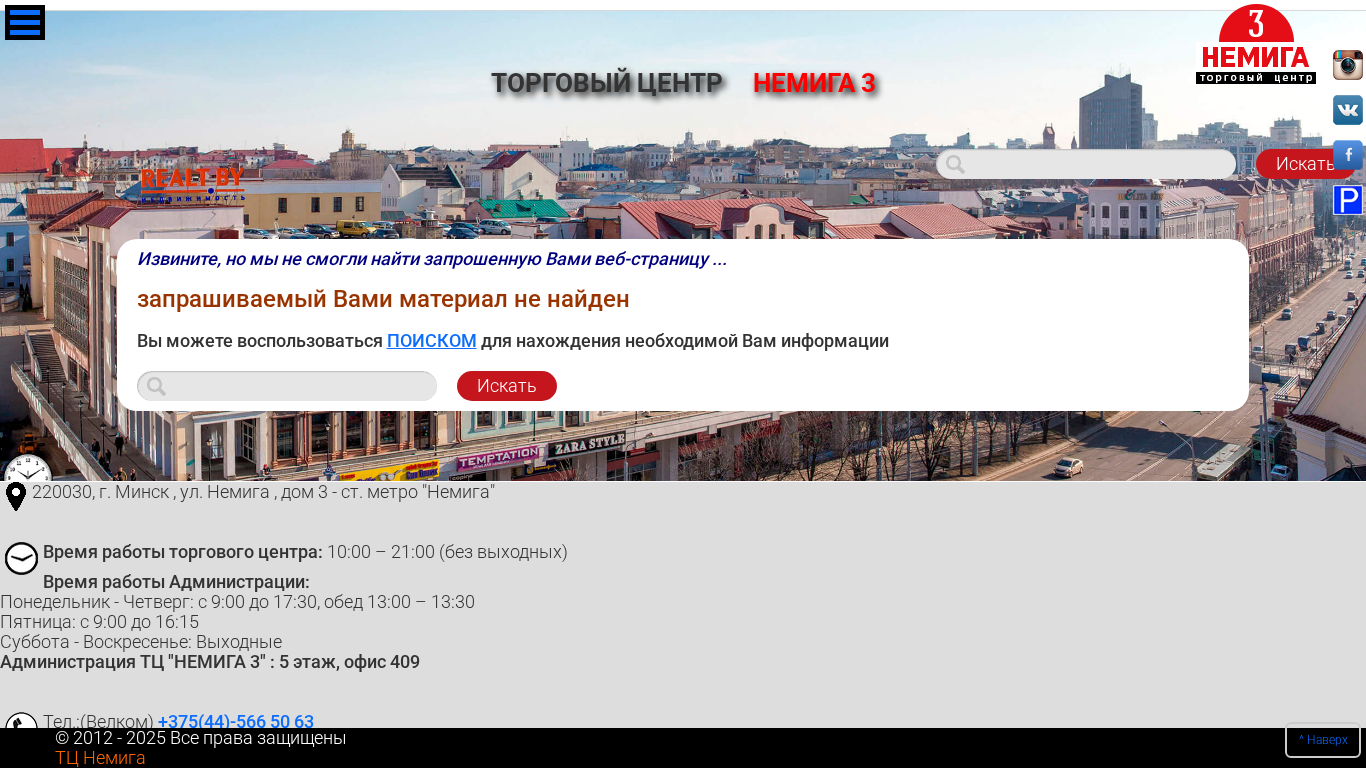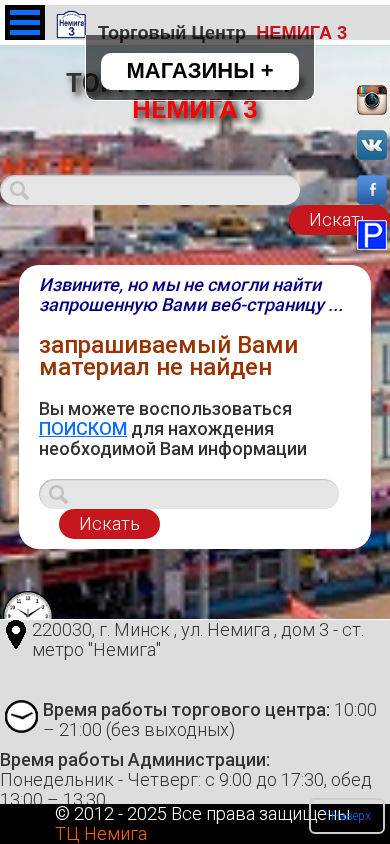 | Название / Заголовок | Торговый Центр «НЕМИГА 3» - запрашиваемый Вами материал не найден |