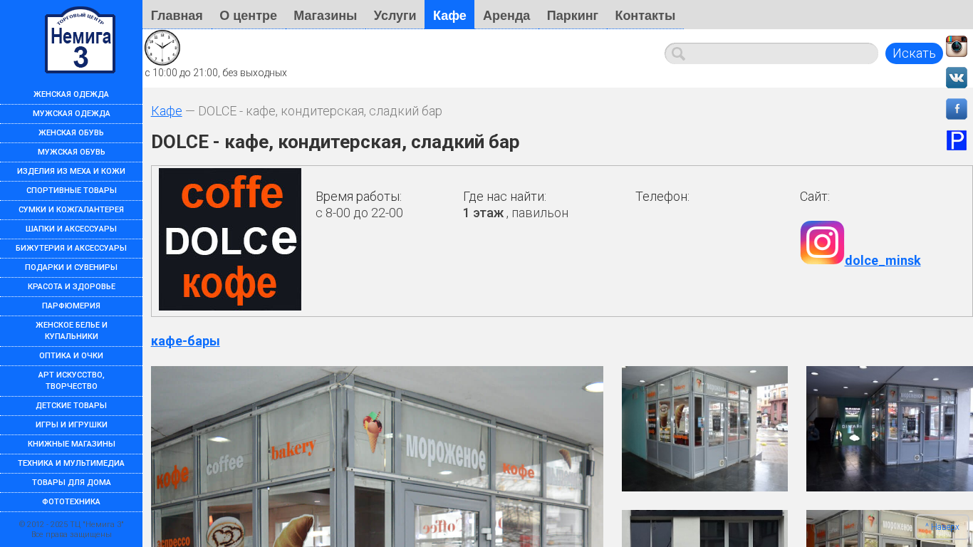 | Название / Заголовок | DOLCE - квфе, кондитерская, сладкий бар :: Торговый Центр НЕМИГА 3 |