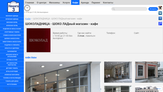 This website is for the "Шоколадница" (Chocolatnica) shop located in the Nemiga 3 shopping center in Minsk, Belarus. The website offers various types of clothing, footwear, and accessories for both men and women, as well as items made of leather and meh (animal hide). There are also sections for sports goods, bags and leather goods, hats and accessories, jewelry and accessories, gifts and souvenirs, beauty and health products, perfumes, women's lingerie and swimwear, optics and eyeglasses, art and crafts, children's goods, games and toys, books, electronics, home goods, photography equipment, and other miscellaneous items. The shopping center, Nemiga 3, houses various shops, offices, services, cafes, and parking facilities. The website provides information on the center's location