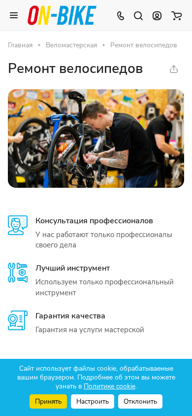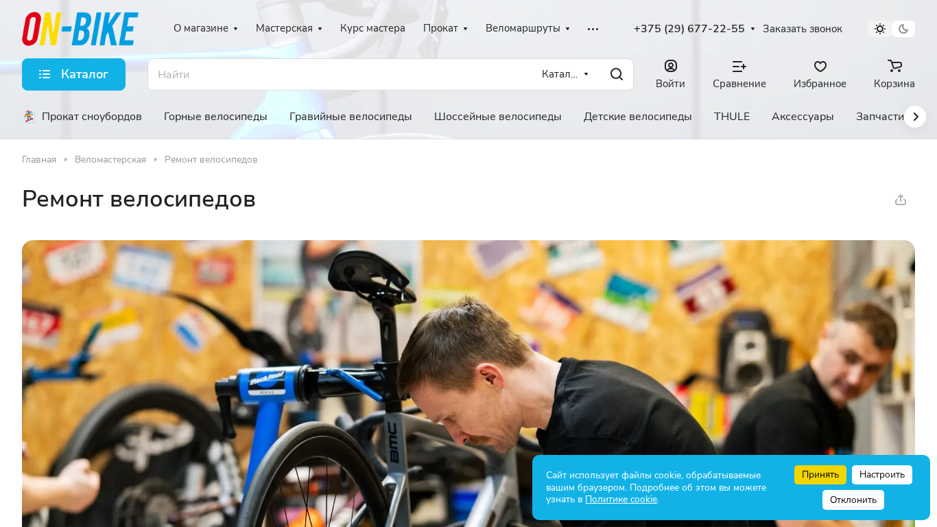 | SEO-описание | ON-BIKE ✔️ - Велосипедная мастерская в Минске ⭐️. В нашем велосервисе мы оказываем услуги по ремонту и техническому обслуживанию (ТО) ⚡️ горных (MTB), шоссейных, гравийных, детских велосипедов любой сложности. Ознакомьтесь с ценами на наши услуги в прайс-листе ⚡️ на сайте. Наши мастера помогут выполнить ремонт вашего байка ⭐️. |