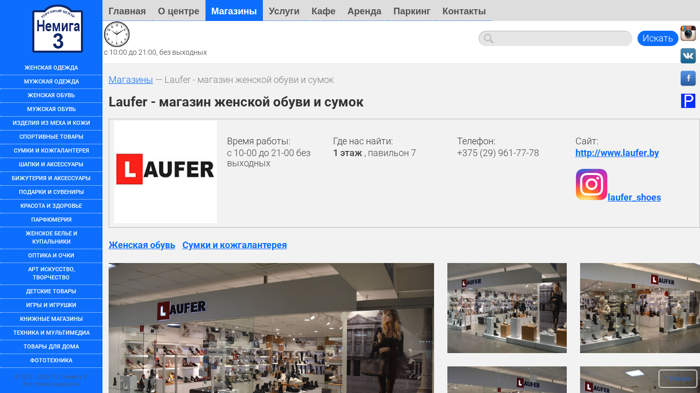| AI-анализ | The web project "Laufer" is a women's shoe and bag store located in the Nemiga 3 Shopping Center in Minsk, Belarus. The shopping center offers a variety of shops, offices, services, cafes, and parking. The "Laufer" store is included in the listings for women's clothing, men's clothing, footwear, leather and meh products, sports goods, handbags, hats and accessories, jewelry, gifts and souvenirs, beauty and health, perfumery, lingerie and swimwear, optics, art and creativity, children's goods, games and toys, bookstores, technology and multimedia, household items, photography equipment, and other goods. The store can be found on the first, second, and third floors of the shopping center, along with offices and other rentals. The shopping center's rules |