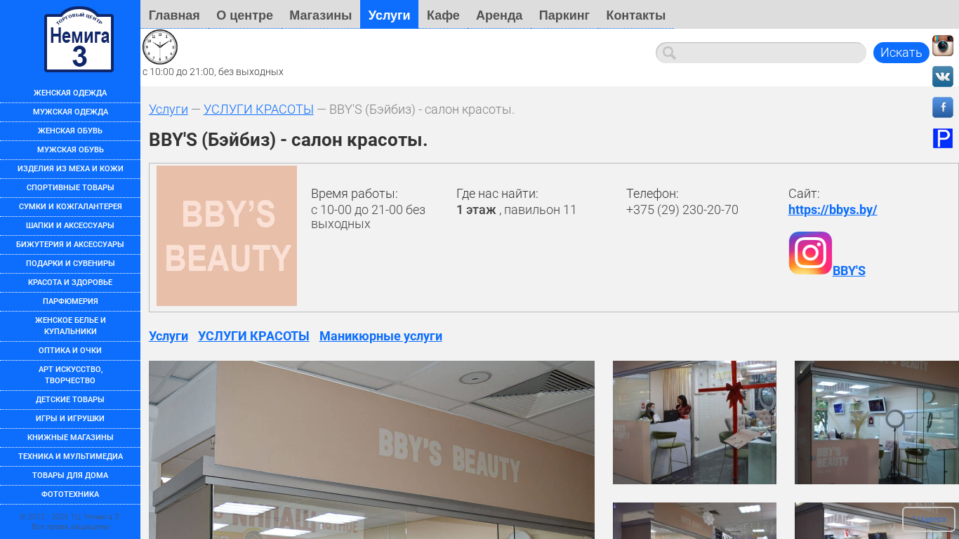 | AI-анализ | The portal bbys.nemiga3.by is a part of the Nemiga 3 shopping center in Minsk, Belarus. It offers a range of services including makeup, manicure, pedicure, hairstyling, eyelash extensions, and eyebrow correction. The shopping center, which also houses various retail stores, offices for rent, cafes, and other services, is located in Minsk and provides a comprehensive shopping experience for visitors. The website includes sections for women's and men's clothing, footwear, accessories, beauty and wellness products, and various other goods and services. The shopping center's rules, opening hours, and contact information are also accessible on the website. |