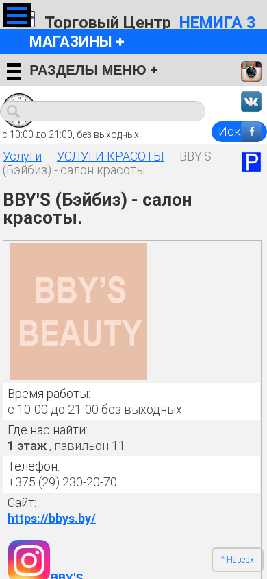 | Название / Заголовок | BBY'S - студия услуг по макияжу, маникюру, педикюру, прическам, ресницам, коррекции бровей :: Торговый Центр НЕМИГА 3. г.Минск |