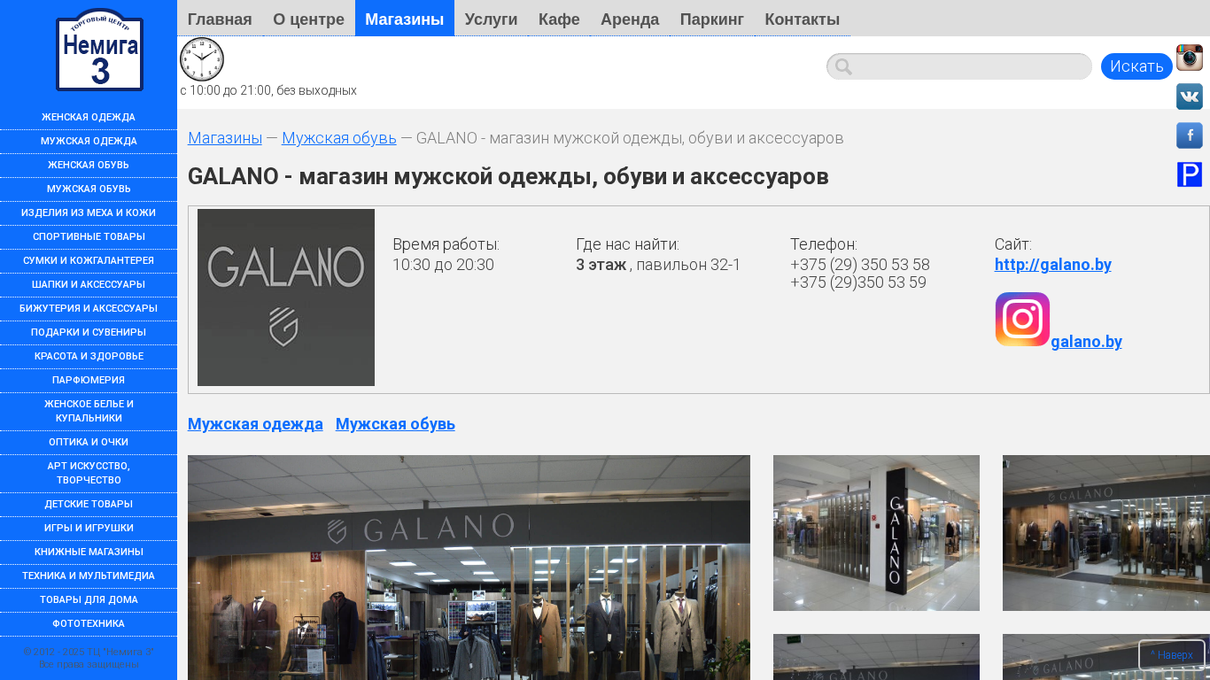 | Название / Заголовок | «GALANO» - мужская одежда, обувь и аксуссуары ::Торговый Центр «Немига 3» |