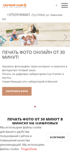 | AI-анализ | --- The web project ukadr.by is a photo printing service with a network of photo centers under the brand "Удачный кадр" (Lucky Shot). The description tag mentions "Printing photos in 30 minutes at digital laboratories." The website features a table layout for displaying photo lab locations, with columns for city name, address, phone number, and hours of operation. The design includes a tabbed interface for navigating between sections of the site, with tabs labeled "Labs," "Services," and "Contacts." The color scheme is predominantly white with accents of red. |