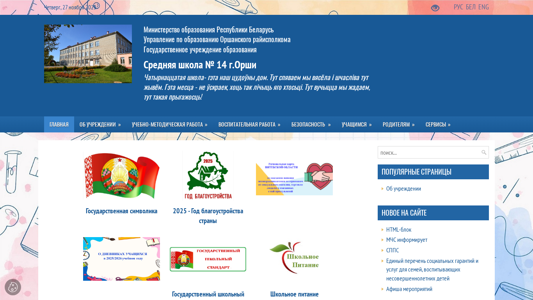| AI-анализ | This website is for Orsha Secondary School No. 14, providing information about the school and its activities. The website includes sections on school news, a virtual school cabinet, administrative procedures, and a school canteen. The homepage displays the current date and information from the Ministry of Education of the Republic of Belarus. The site also features a biography of the school and its history, as well as a calendar of notable and memorable dates. There are sections dedicated to electronic educational resources, and a library with a reading room and a section for parents. The site includes information on the school's position on data processing, as well as a rating portal for evaluations. There are also sections on methodological work, inclusive education, self-study, innovation, and agricultural classes. The site provides information on various school events, contests, and olympiads. Virtual cabins for subjects such as geography, biology |