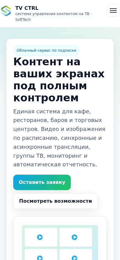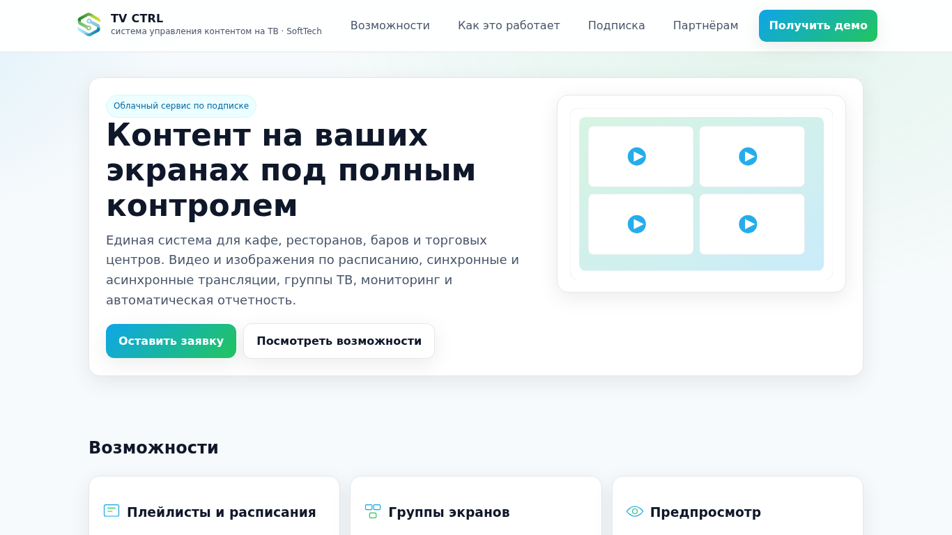 | SEO-описание | TV CTRL — облачная система управления контентом на экранах ТВ для кафе, ресторанов, баров и торговых центров. Плейлисты, расписания, группы экранов, мониторинг и отчеты. |