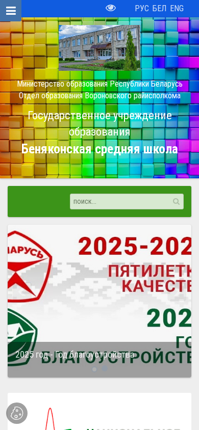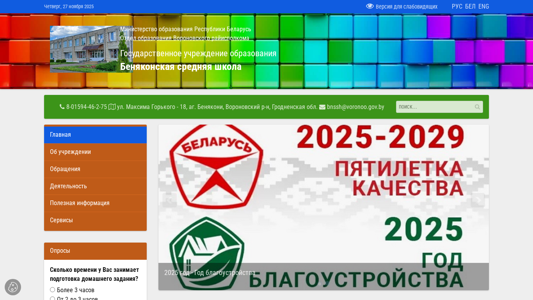 | AI-анализ | The web project "Беняконская средняя школа" (Benyaonskaya Srednyaya Shkola) is a Belarusian education institution based in the village of Benyakoni, in Voronovsky district, Grodno region. The website provides information about the school, its activities, and upcoming events. The most frequently used keywords on the site include "November 2025," "education," "work," and "detailed." The site also features news about the region and various school-related topics, such as "Healthy Lifestyle," "Anti-Corruption Legislation in Belarus," and "Week of Cybersecurity." The site includes sections for different student groups, such as "Rubber Ducks" and "Shashki," and features information about various thematic classes and meetings with military commissioners. The site |